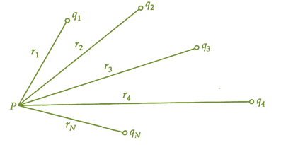 V=14πϵ0[q1r1+q2r2+q3r3+……+qNrN]V=14πϵ0[q1r1+q2r2+q3r3+……+qNrN]