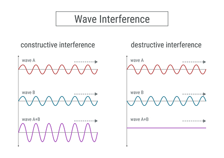 - Destructive Interference: when two waves are propagated in the same direction with the same speed but out of phase, these waves form destructive interference. The amplitude of the resultant is less than the individual waves.