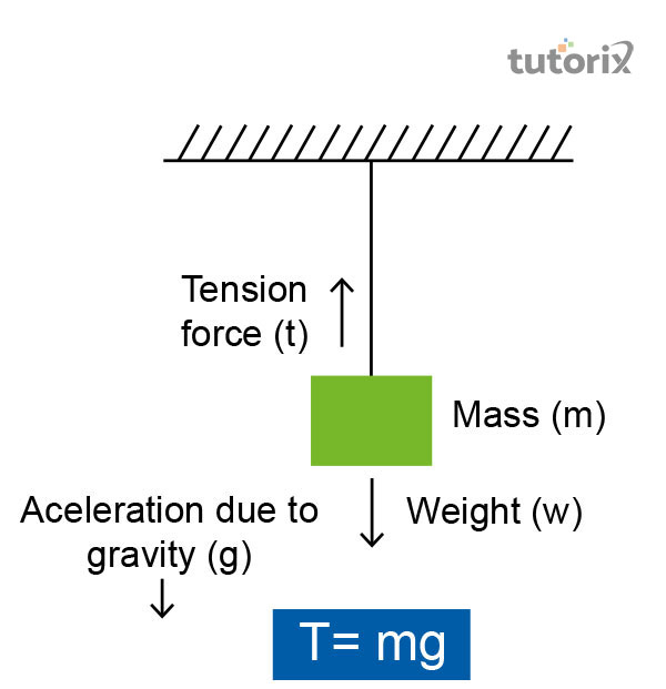 Here, T is tension and highlights the condition, T= tension (Norkg−m/s2Norkg−m/s2) g = acceleration due to gravity ⟮9.8m/s2⟯⟮9.8m/s2⟯.
